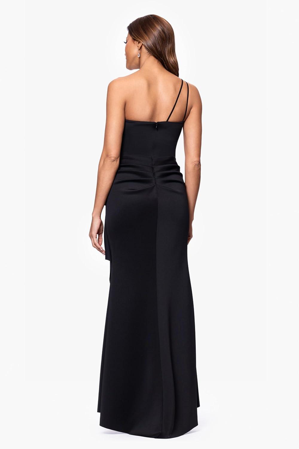 This sophisticated one-shoulder gown is designed for timeless elegance and modern flair. The asymmetrical neckline highlights the shoulders, while the fitted bodice flatters the silhouette. A cascading ruffle detail on the side, complete with a delicate bow accent, adds a touch of femininity and movement to the floor-length skirt. Perfect for formal events, weddings, or galas, this gown ensures a polished and graceful look.