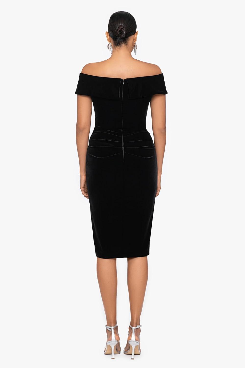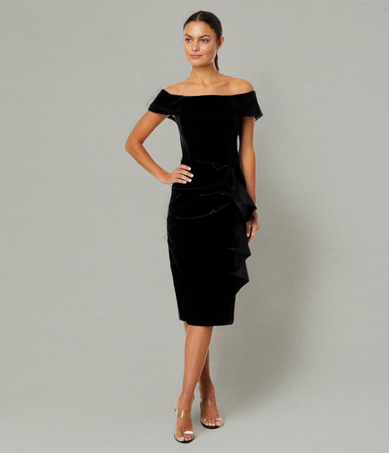 Xscape Women’s Knee Length Off-The-Shoulder Scuba Side Slit Dress(Black)