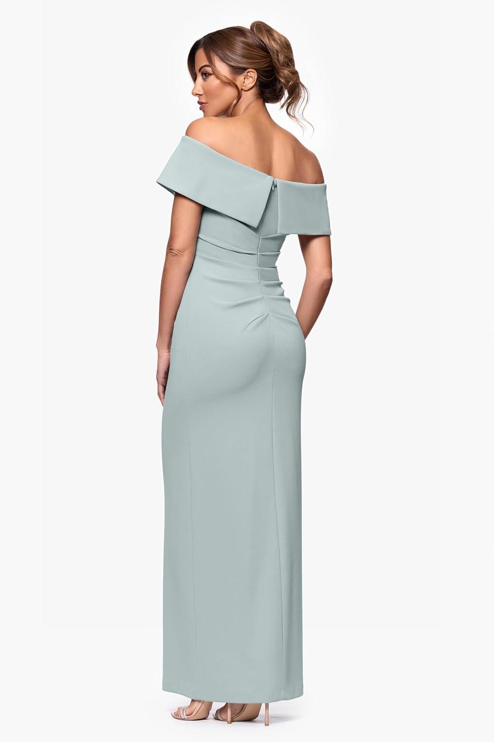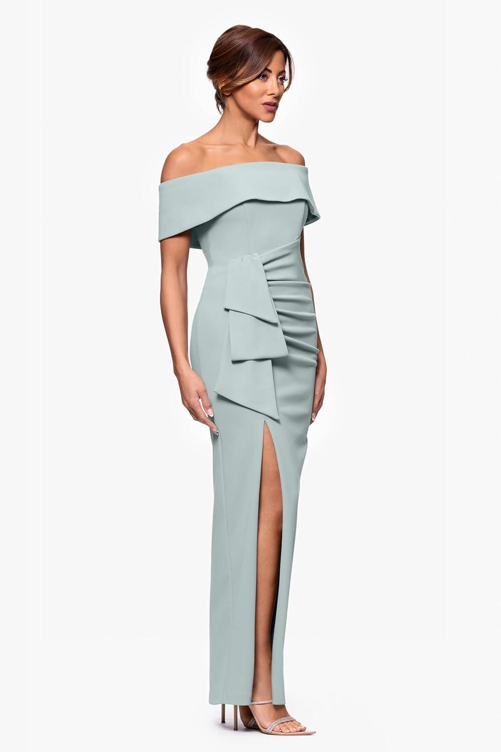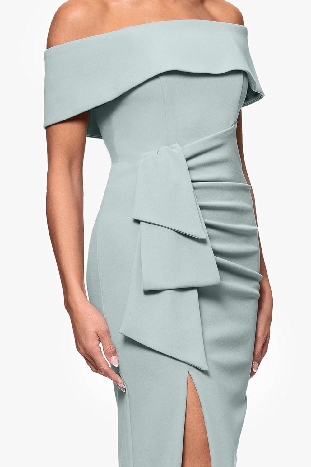 Xscape Women’s Long Off The Shoulder Scuba Crepe Slit Dress(Sage)