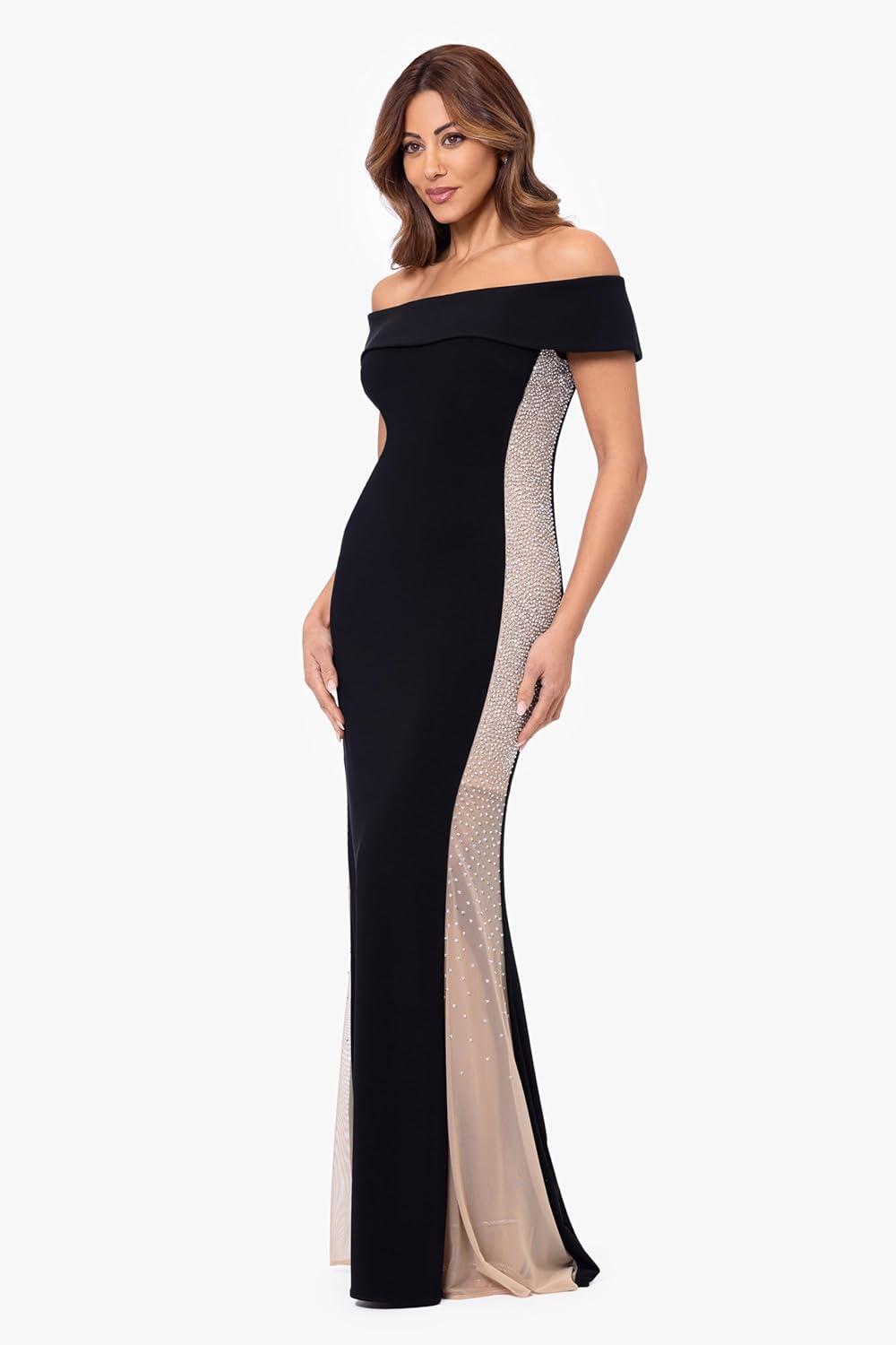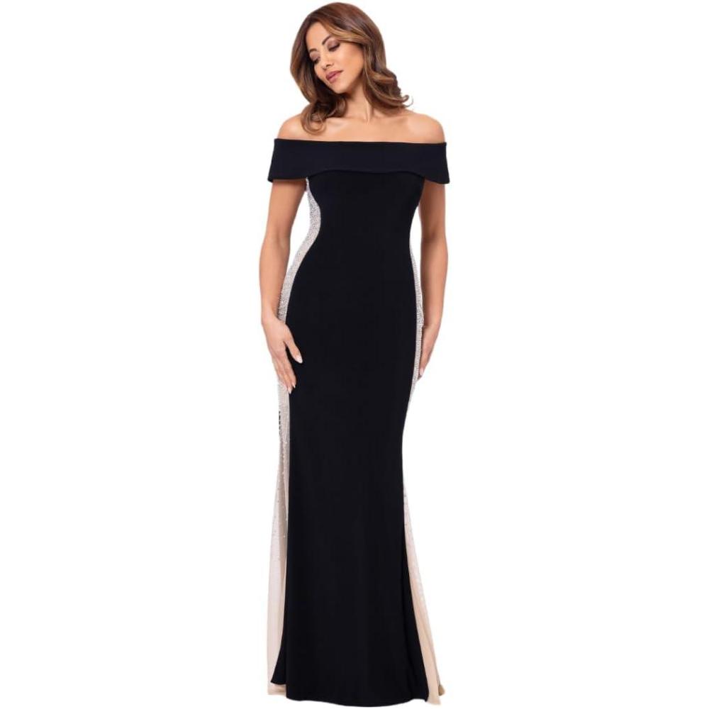 Xscape Women’s Off The Shoulder Beaded Bodycon Formal Maxi Dress(Black Nude Silver)