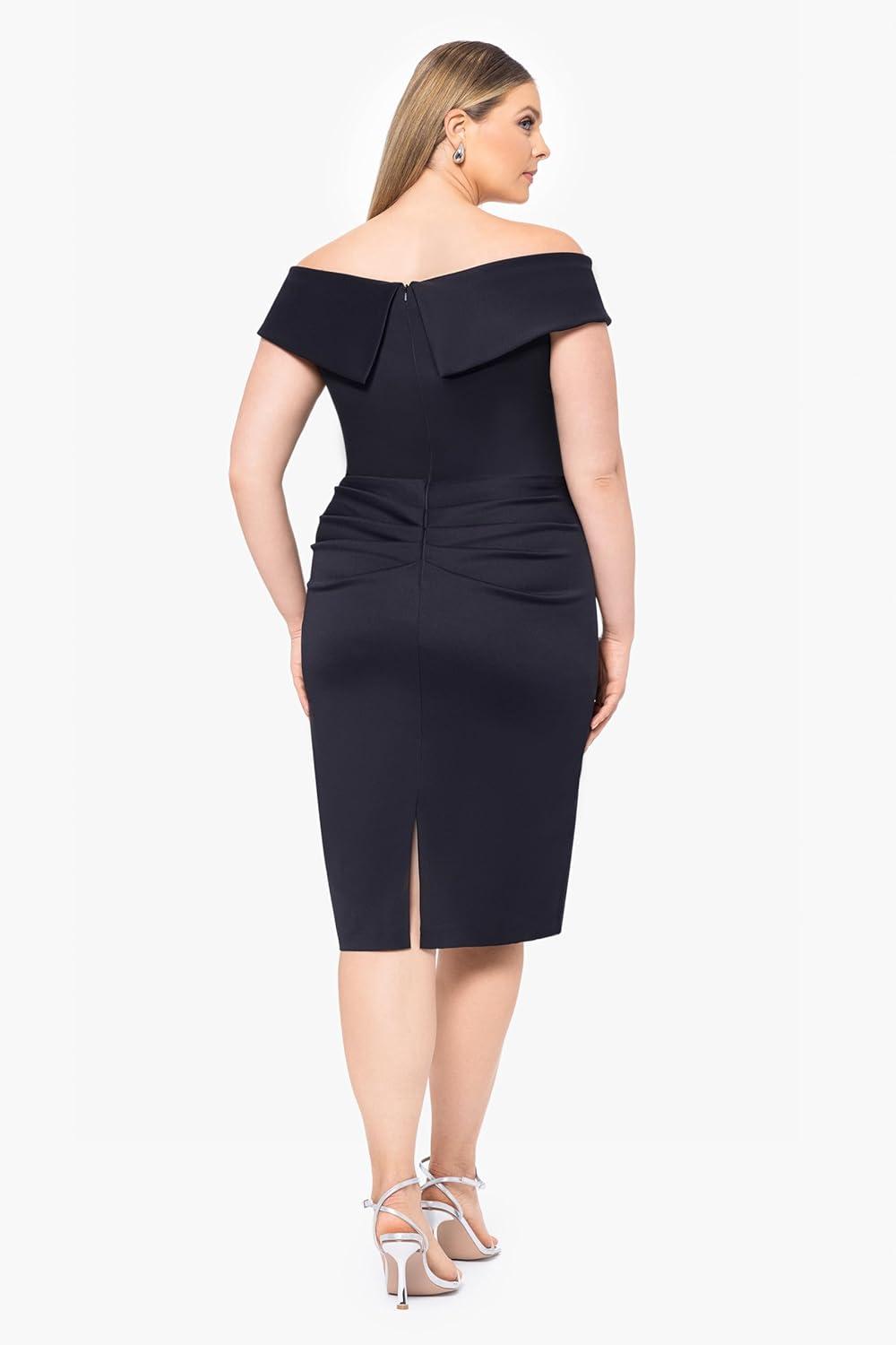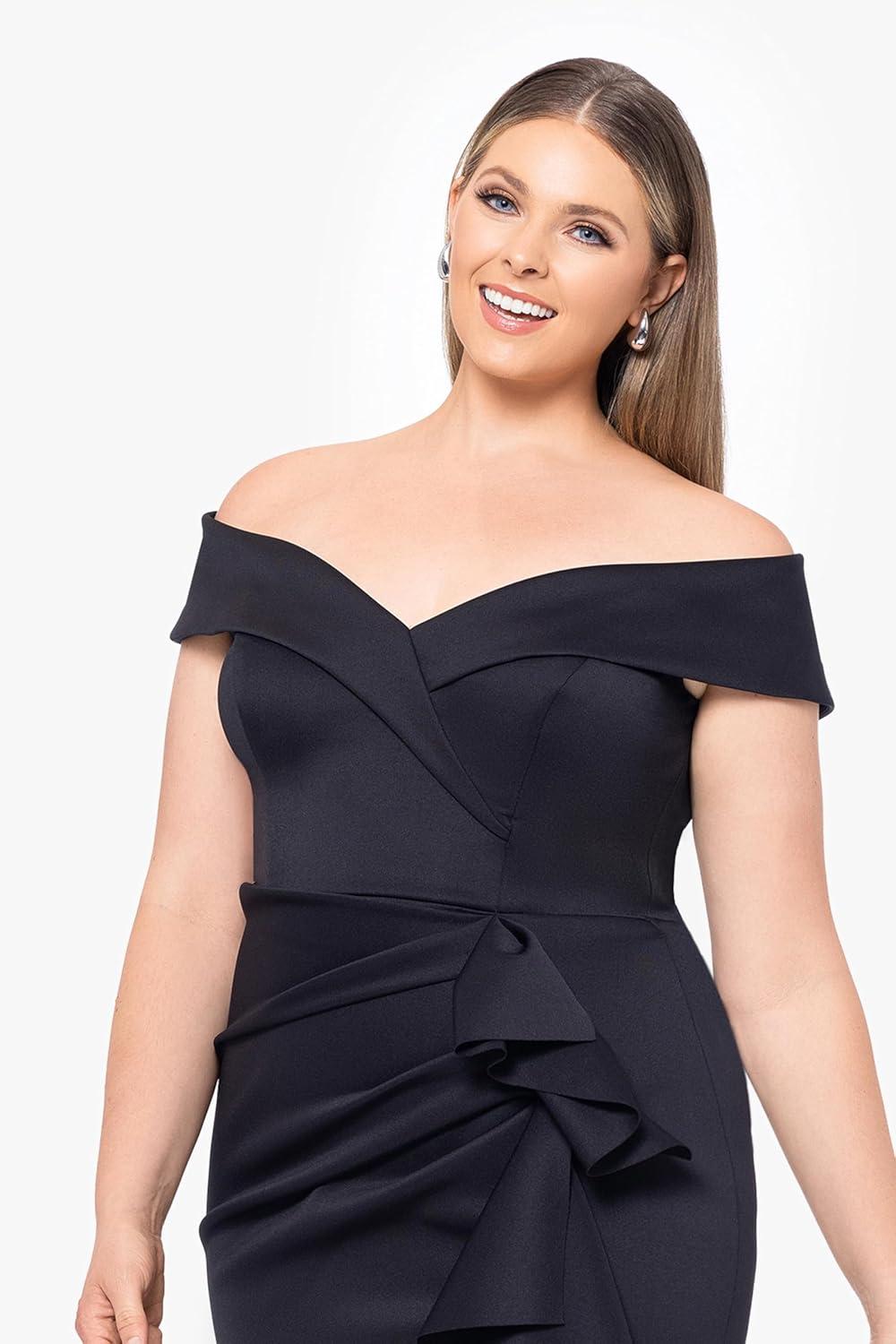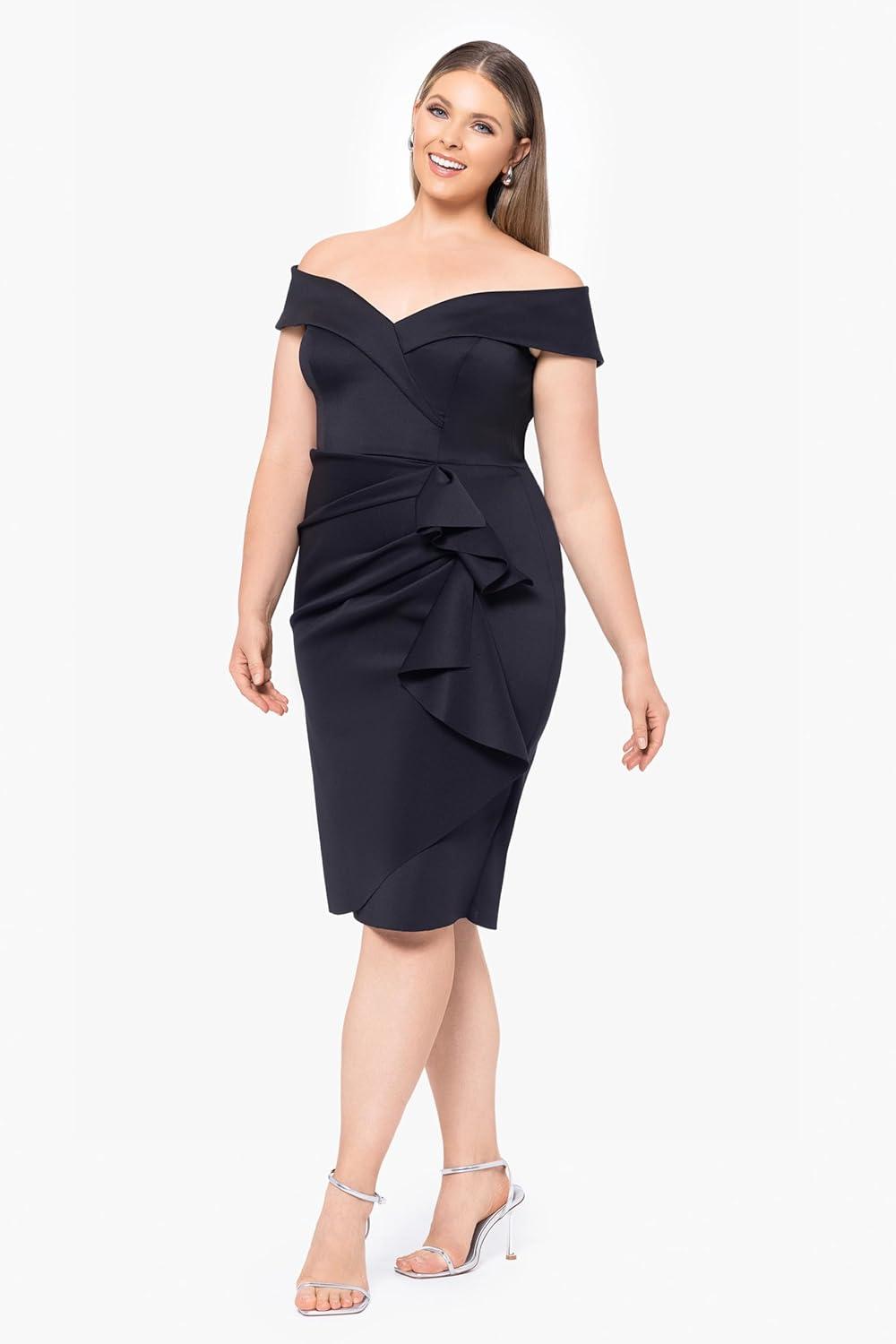Xscape Women’s Plus Short Scuba Off-The-Shoulder Ruffle Midi Dress with Center Back Zipper, Black, 14W