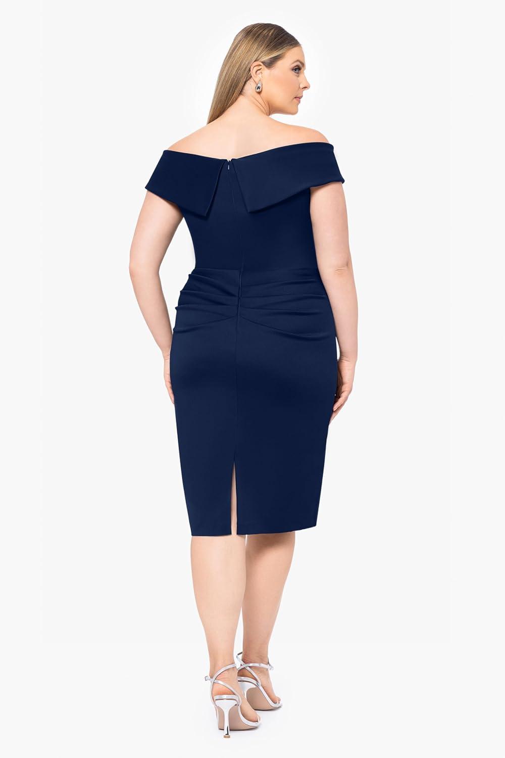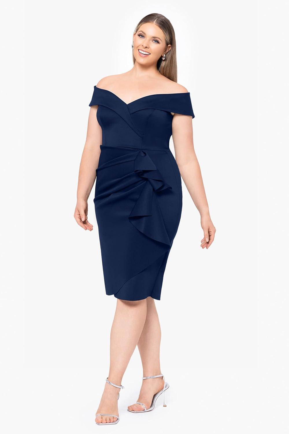 Xscape Women’s Plus Short Scuba Off-The-Shoulder Ruffle Midi Dress with Center Back Zipper(Midnight)