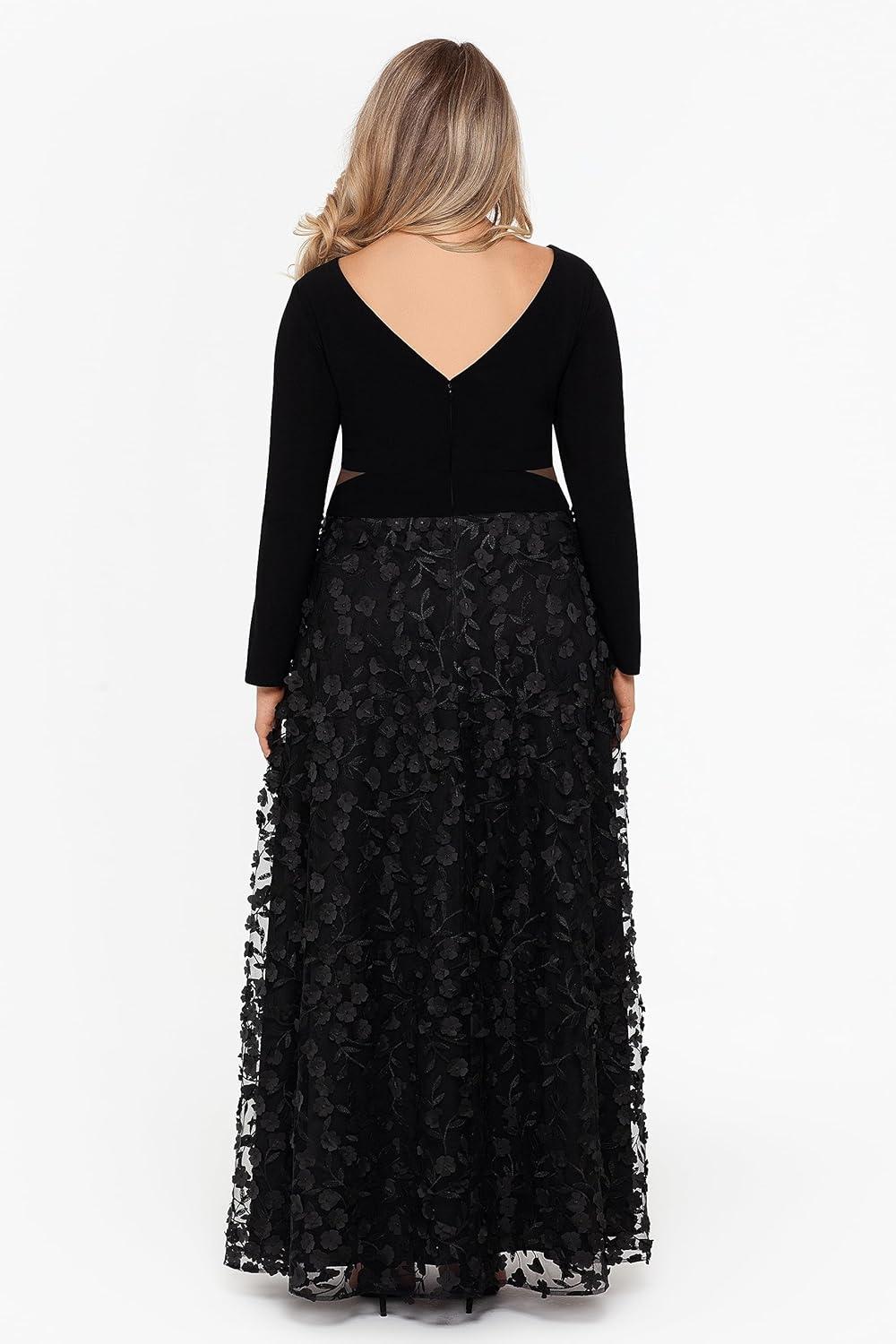 Xscape Womens Plus Size Long Sleeve V-Neck Floral Skirted DressSpecial Occasion Dress(Black)