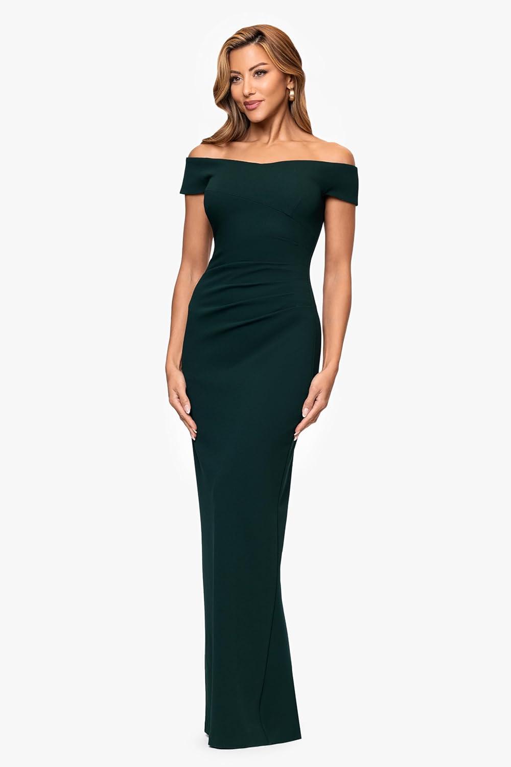 Xscape Women’s Scuba Crepe Short Sleeve Off The Shoulder Ruched Floor Length Dress(Pine)