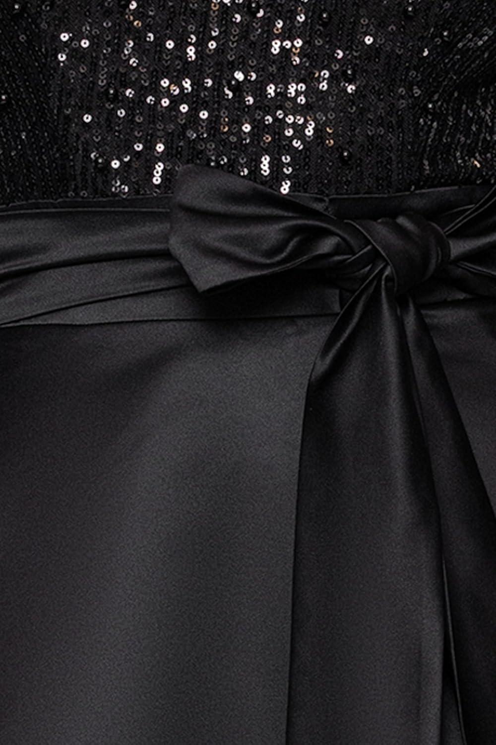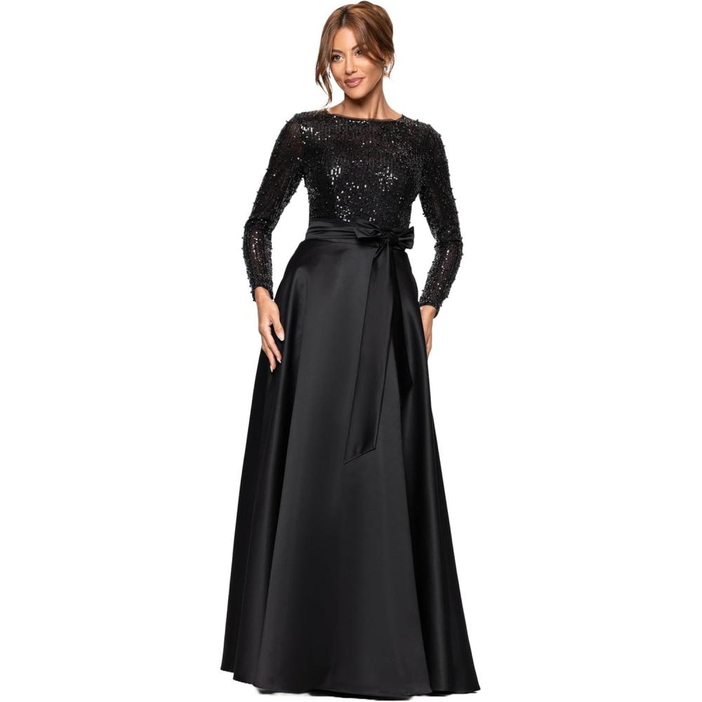 Xscape Women’s Sequin Bodice Long Sleeve Satin Skirt and Bow A-line Floor Length Dress(Black)