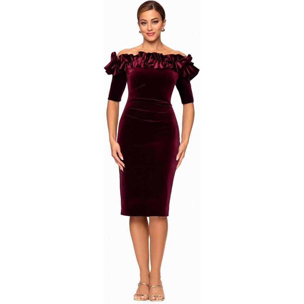 Xscape Women’s Velvet Off The Shoulder Ruffle Neckline Knee Length Dress(Burgundy)