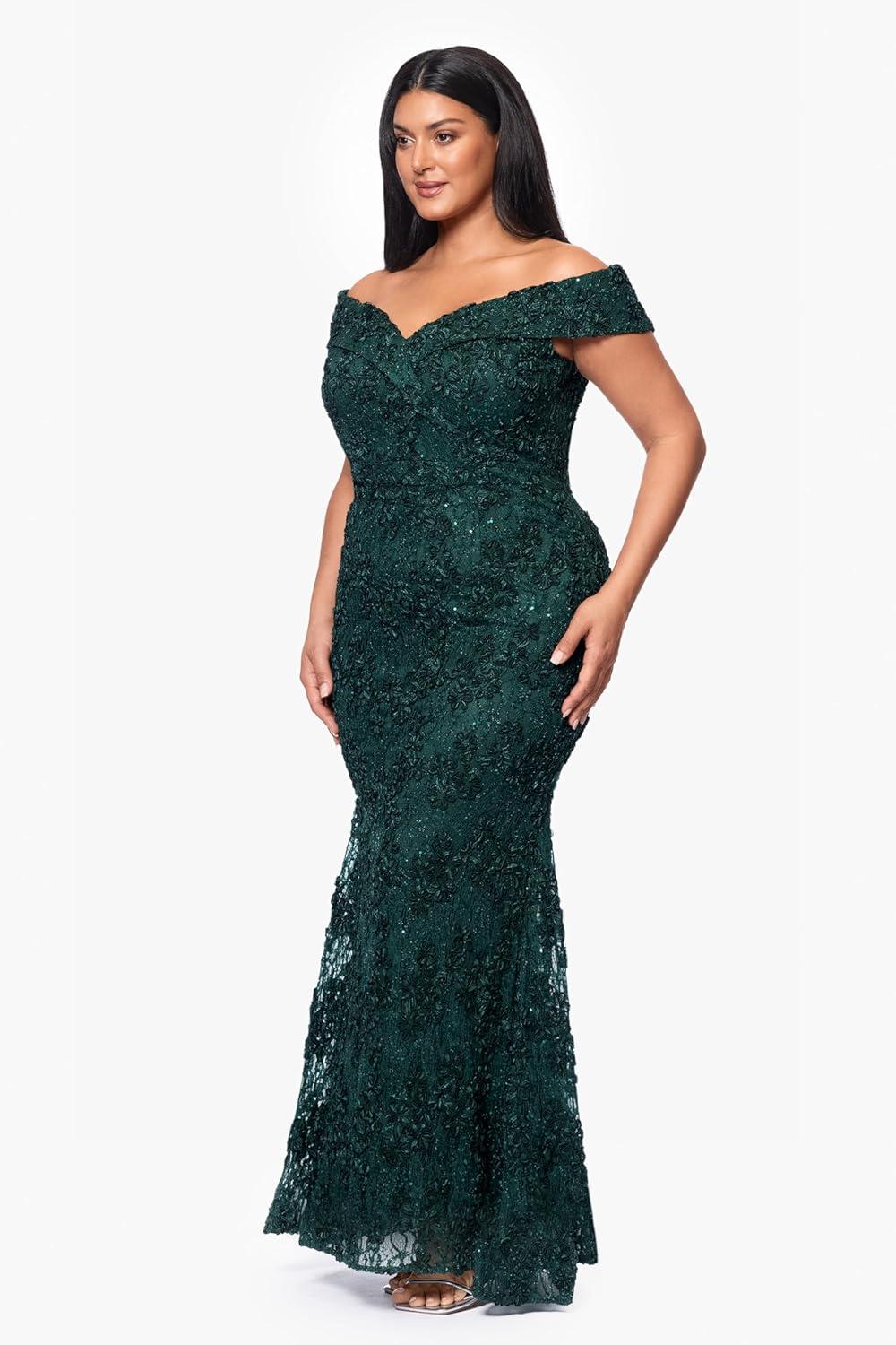 Xscape Womens Women’s Floor-Length, Off-The-Shoulder, with Embellished Lace Detail and Fitted Silhouette(Hunter Green)