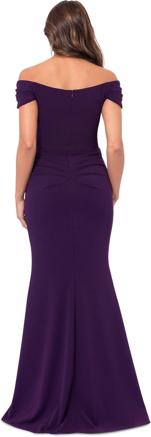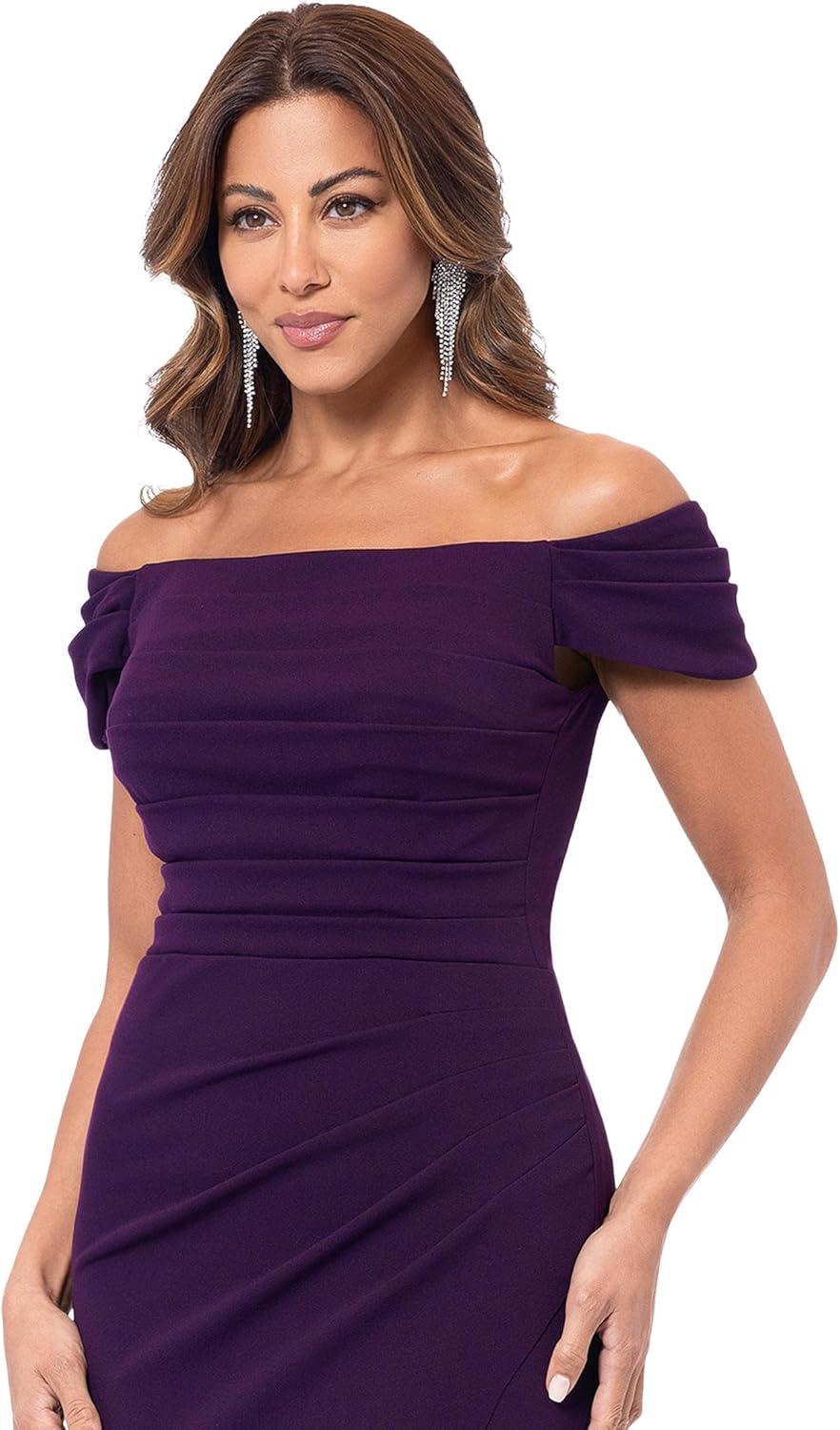 Xscape Womens Women’s Off-The-Shoulder Gown with Pleated Bodice, Draped Detail, and Fitted Silhouette.(Mulberry)